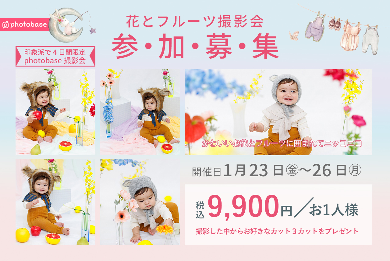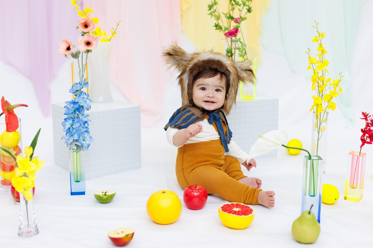 カラフルなお花とフルーツに囲まれて撮影しよう!普段と違う、わが子のちょっと大人な雰囲気に、思わず「きゅん」としちゃう撮影会です。