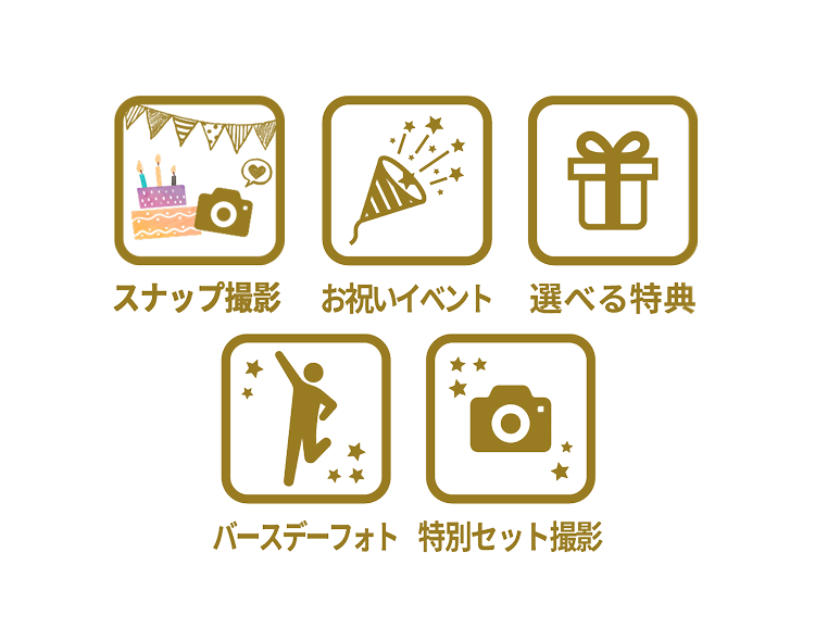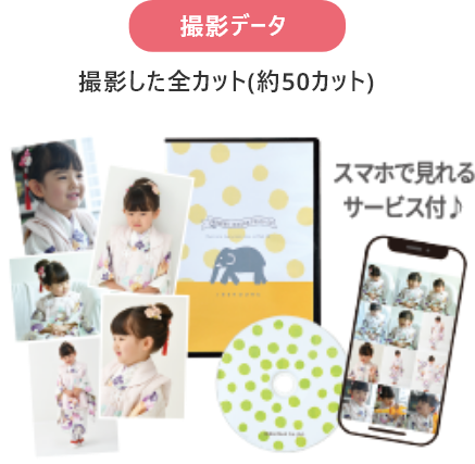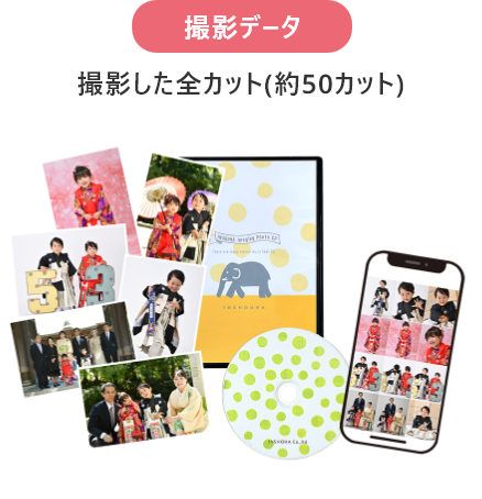 撮影料 + ビジュアル台紙(6カット) + 全カットデータ + 選べるフォトフレーム + フォトグッズ