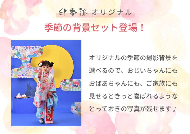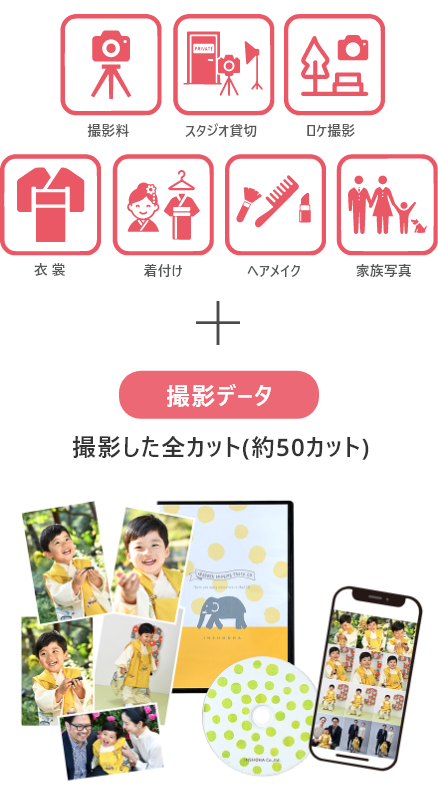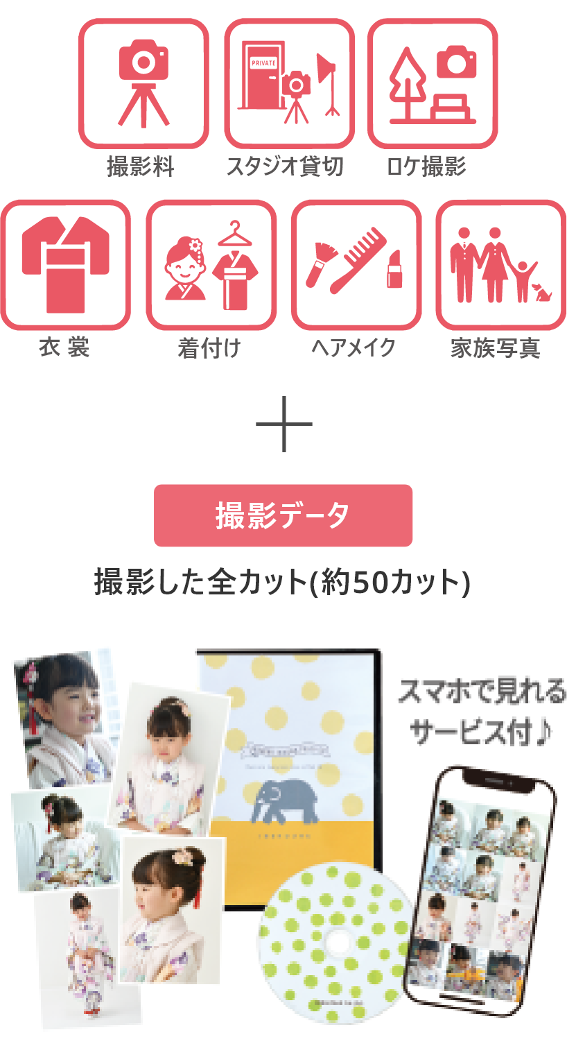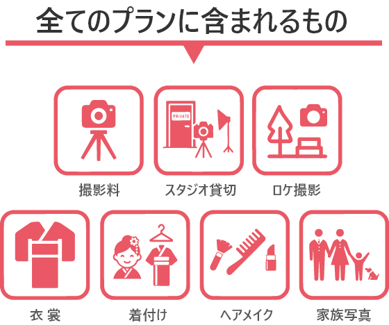 衣装レンタル、着付け、ヘアメイク、撮影料、スタジオ貸切、ロケ撮影まで全てセットになっているので、事前準備は不要です。